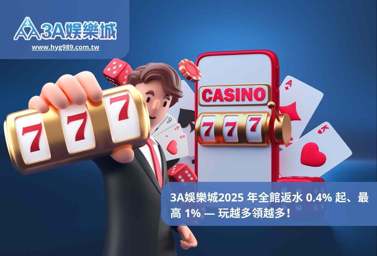 返水比例範圍:3A娛樂城於 2025 年宣傳「全館返水 0.4% 起、最高 1%,玩越多領越多」。